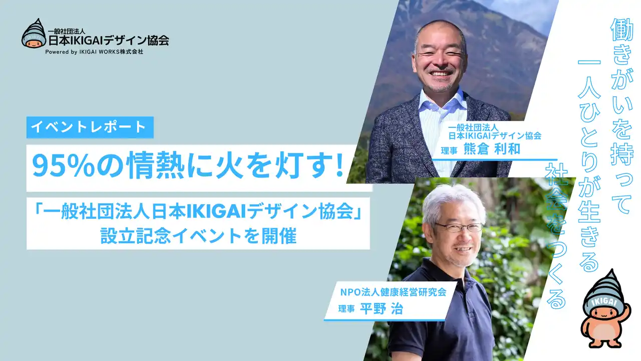 一般社団法人日本IKIGAIデザイン協会(本社:山梨県北杜市、代表理事:熊倉 利和)と、IKIGAI WORKS株式会社(本社:山梨県北杜市、代表取締役:熊倉 利和)は、「誰もが仕事に働きがい、人生に"生きがい"を持てる社会にする」という情熱のもと活動しています。 |