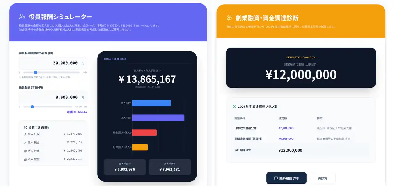 税金や役員報酬のシミュレーション、融資・補助金・助成金の受給可能性診断といった財務・労務に関するツールから、PDF編集や画像圧縮などの日常業務に役立つITツールまで、経営に直結する多彩なツールを無料で解放しています。 |