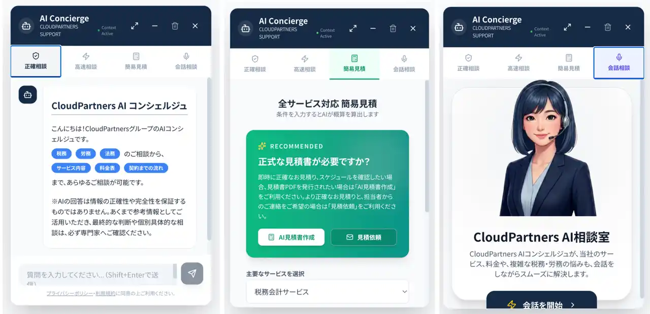 当社の料金やサービスについて24時間即座に回答するだけでなく、会計・税務・労務に関する複雑な質問に対しても、専門家が監修したAIが丁寧かつわかりやすく解説します。さらに、即時に簡易見積の作成依頼や、テキストだけでなくリアルタイムに会話をしながらの高度な相談も可能としています。 |