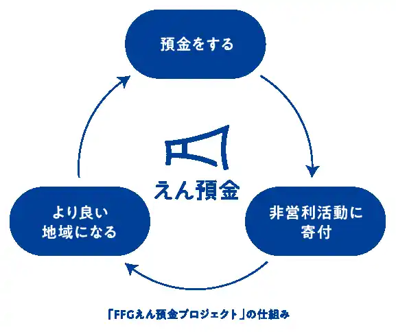 「FFGえん預金」は、期間中に集まった預金残高と預金者による投票に応じた一定割合を、地域で活動する非営利団体・個人に、各銀行が寄付する仕組みを採用。預金者さまのご負担はなく、“預けることで地域を応援できる”という手軽さが特徴です。 |