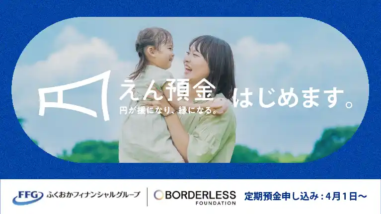 NPO法人ボーダレスファウンデーション(所在地:福岡県福岡市、代表理事:田口一成)は、株式会社ふくおかフィナンシャルグループ(所在地:福岡県福岡市、取締役社長:五島 久、以下 FFG)と共同で、寄付型定期預金「 FFGえん預金」を本日より開始します。この定期預金は、FFG傘下の福岡銀行、熊本銀行、十八親和銀行、福岡中央銀行で取り扱います。 |