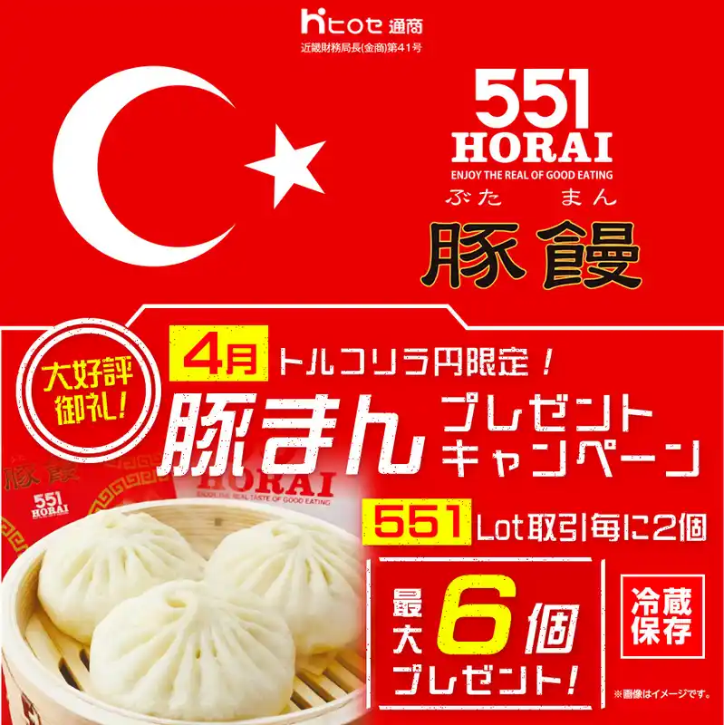 ヒロセ通商株式会社 (本社:大阪府西区、代表取締役:野市 裕作、以下:当社)は、当社の提供する「LION FX」において、2026年4月1日(水)より、「LION FXトルコリラ円限定 551Lot取引で豚まんプレゼントキャンペーン」を実施することをお知らせいたします。 |