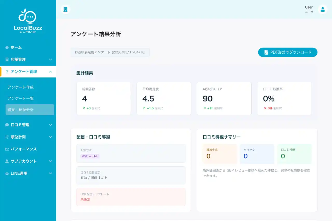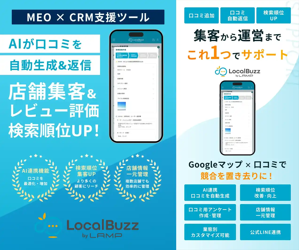 こうした背景を踏まえ、LAMPがD2Cで培ってきた知見をリアル店舗集客の仕組みとして構築したのが、AIとLINEを活用して口コミの獲得・管理・分析までを自動化するMEO×CRM支援ツール「LocalBuzz」です。 |
