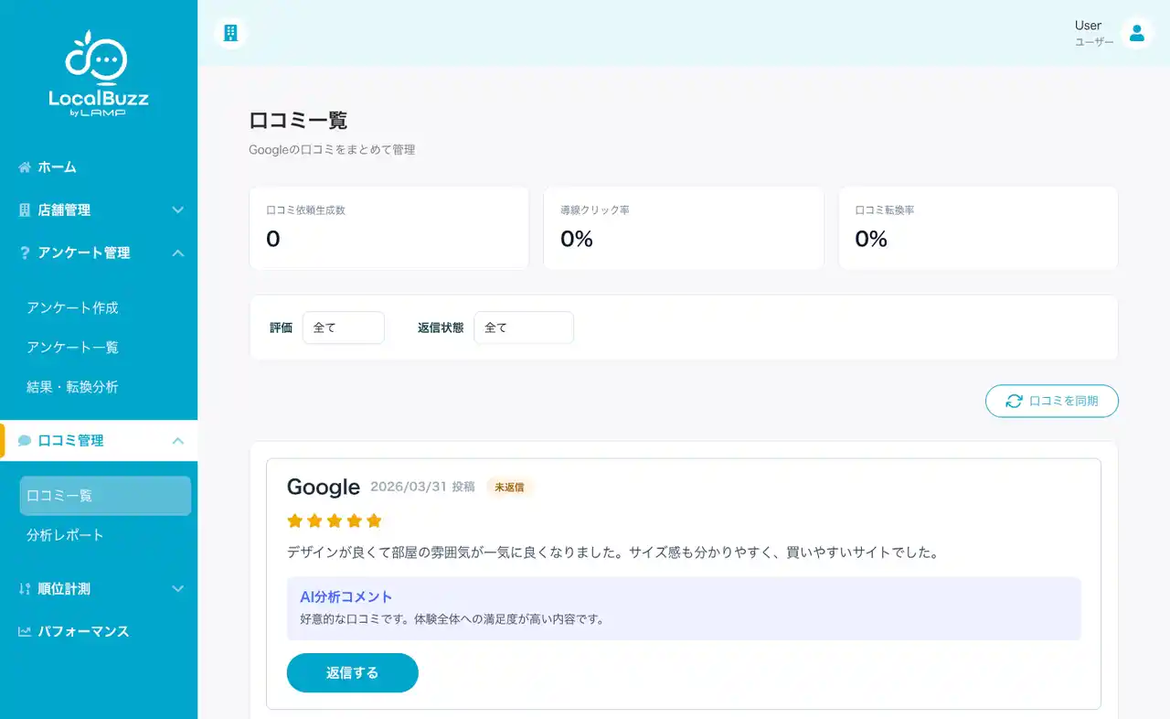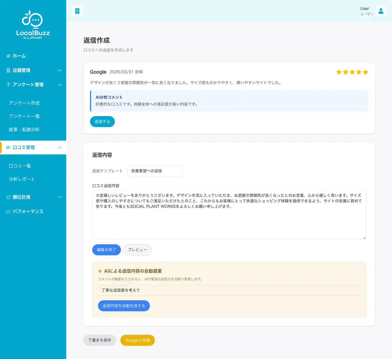3. 口コミ返信の自動生成と属人化の解消:投稿内容をAIがポジティブ・ネガティブに自動判別し、業種別テンプレートに沿った返信文を生成。返信漏れや対応品質のバラつきを防ぎ、「きちんと対応している店」という印象を継続的に可視化。 |