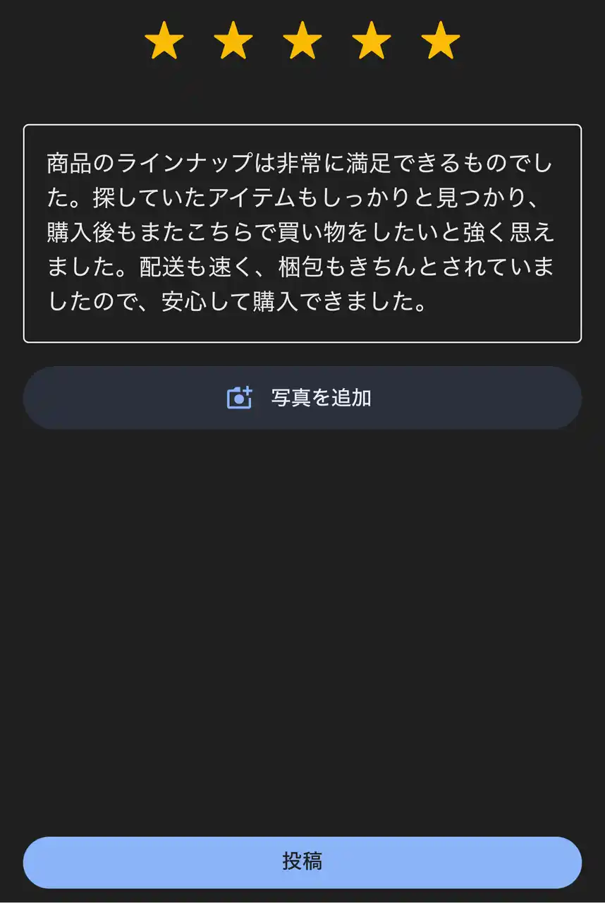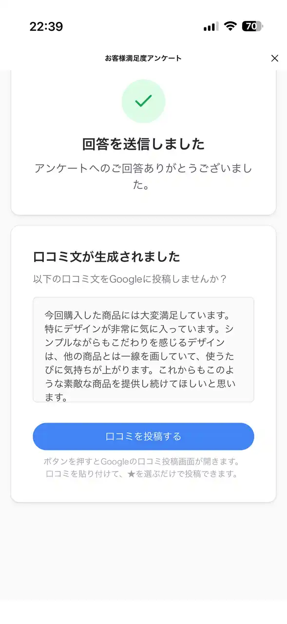1. AIによる口コミ自動生成(200~300字):アンケート回答内容・ユーザー属性・店舗特性をもとに、業態に最適化された自然な口コミ文をAIが自動生成。「不自然な定型文」にならず、実体験に基づいた内容で信頼性を担保。 |