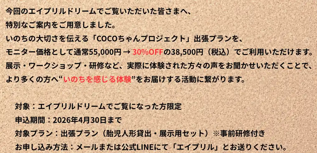 ・出張プラン: 胎児人形のみの貸出・展示用セット(スタッフ同行なし) 5.5万円~ |