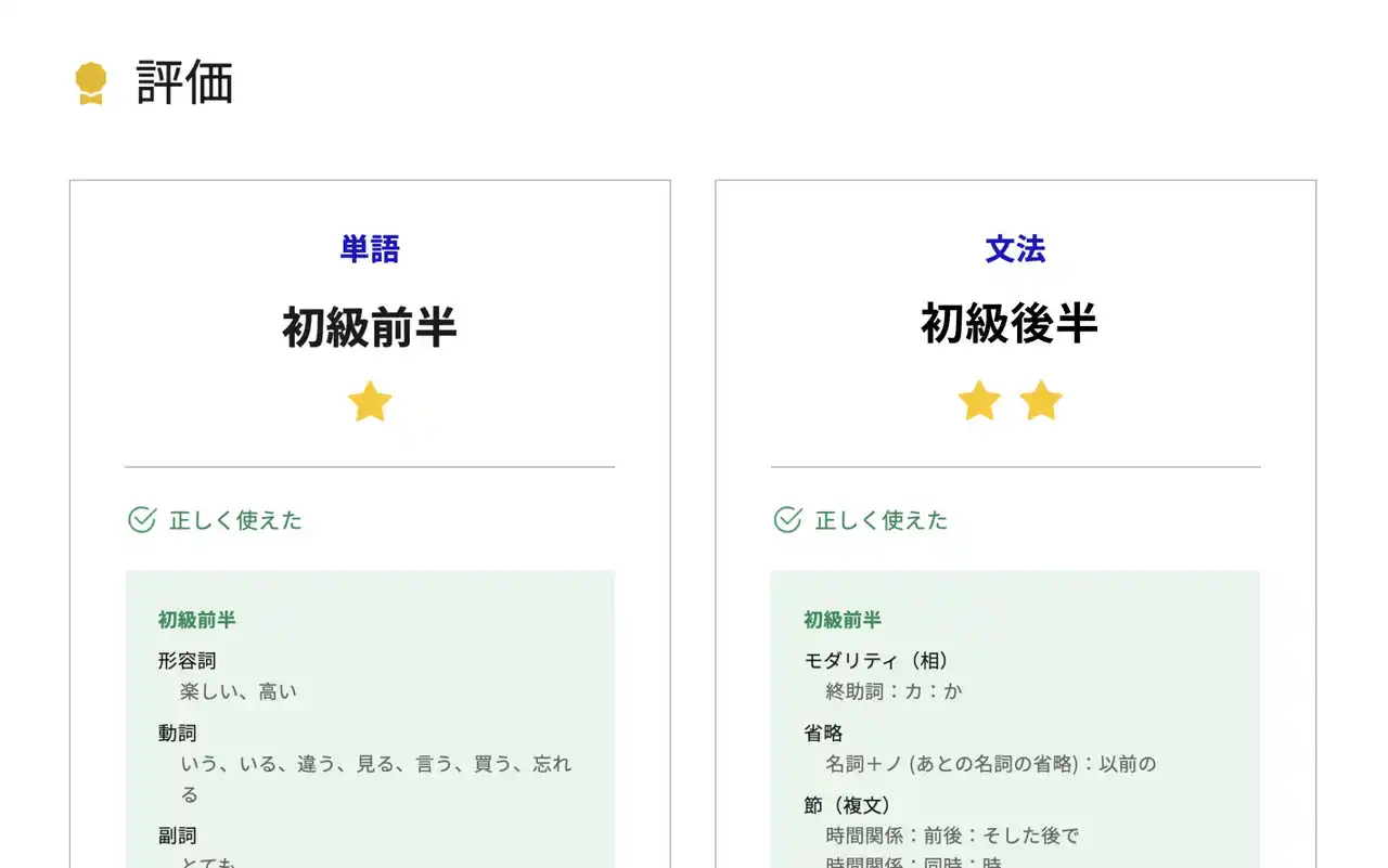 日本語能力に合わせて、フィードバックのレベルを自動で調整します。初級者には基礎的な文法を中心に、中上級者にはより自然な表現を提案するなど、習熟度に合わせたアドバイスを行うため、段階的な学習が可能です。 |