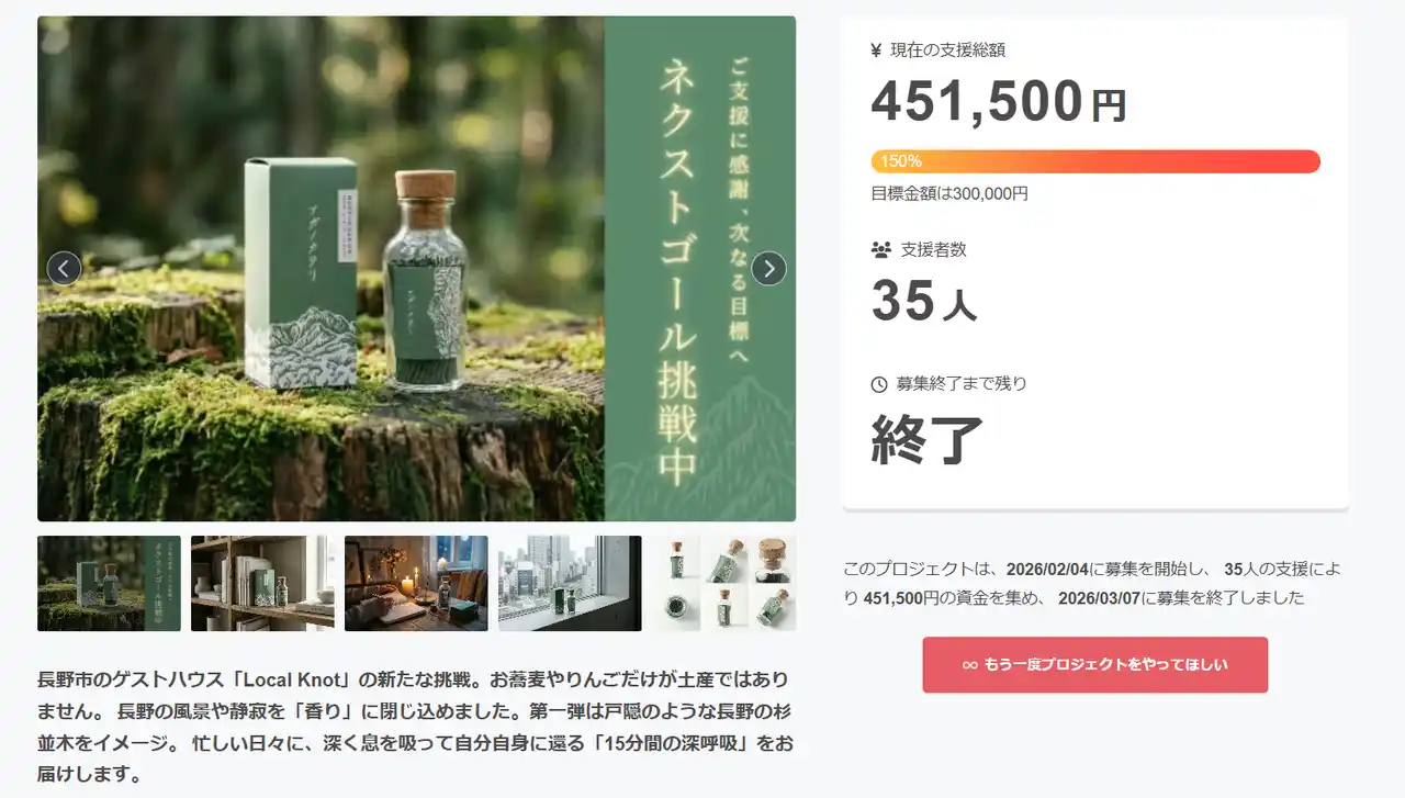支援者からは、 ・「旅の体験を持ち帰れる点が新しい」 ・「日常の中で長野を感じられるのが良い」 といった声が寄せられています。 |
