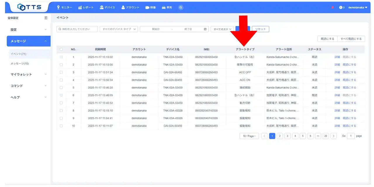 「TTSプラットフォーム画面」速度超過、振動、ジオフェンスの出入り、電源遮断などを検知し通知 |