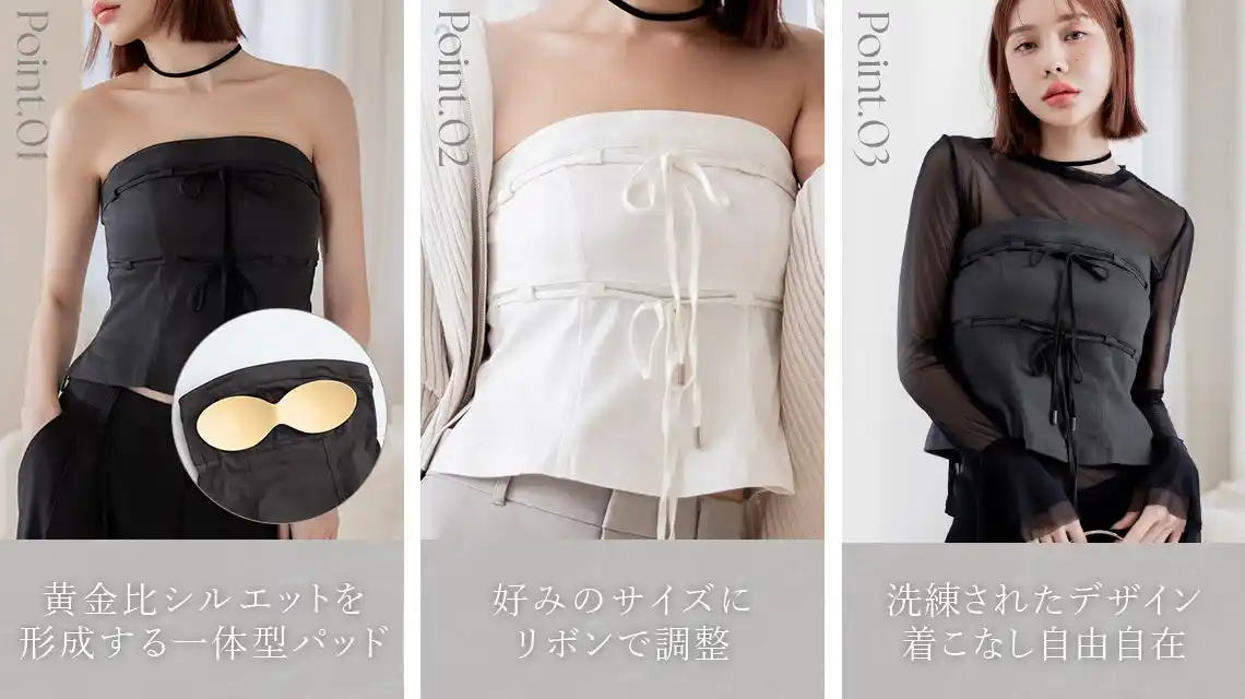 2. ダブルリボン構造による「パーソナルフィット」の実現 デザインの象徴でもあるツインリボンには、調整機能が備わっています。上辺のリボンでストラップレスにありがちな落ちるストレスを解消、アンダーのリボンは体型に合わせてフィット感を微調整することが可能です。個々のボディラインに寄り添う設計により、締め付けすぎることなく、理想のホールド感を長時間維持できます。 |