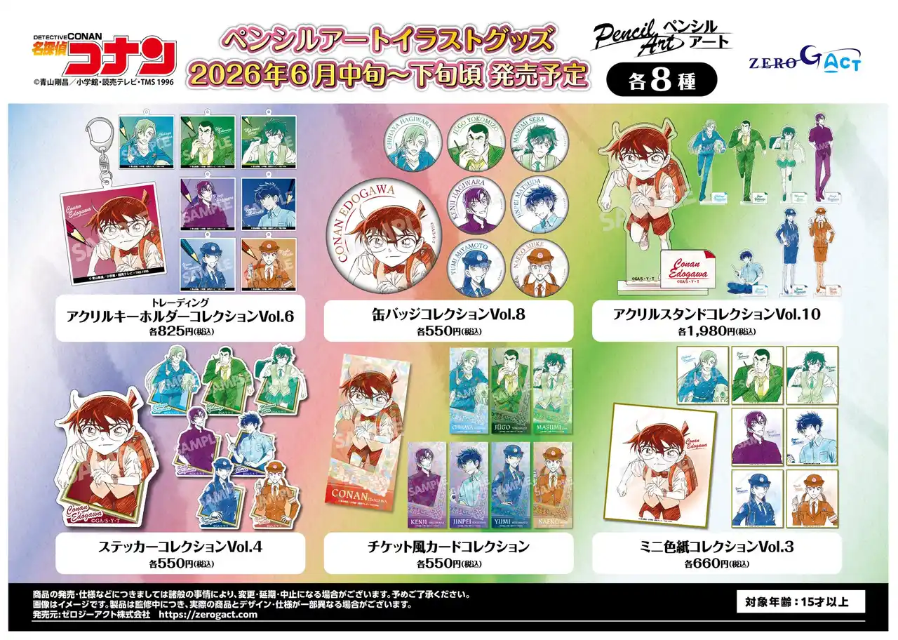 アニメ・キャラクター雑貨や、オリジナル商品の企画デザイン・製造販売を行うゼロジーアクト株式会社(本社:東京都台東区 ※朝日放送グループ)は、「名探偵コナン」ペンシルアートシリーズより、TDアクリルキーホルダーコレクションVol.6、缶バッジコレクションVol.8、アクリルスタンドコレクションVol.10、ステッカーコレクションVol.3、チケット風カードコレクション、ミニ色紙コレクションVol.3の6アイテムの予約受付を開始しました。水彩鉛筆の繊細なタッチが美しい『ペンシルアート』を使用した各アイテムのラインナップは、江戸川コナン・萩原千速・横溝重悟・世良真純・萩原研二・松田陣平・宮本由美・三池苗子の全8種。 |