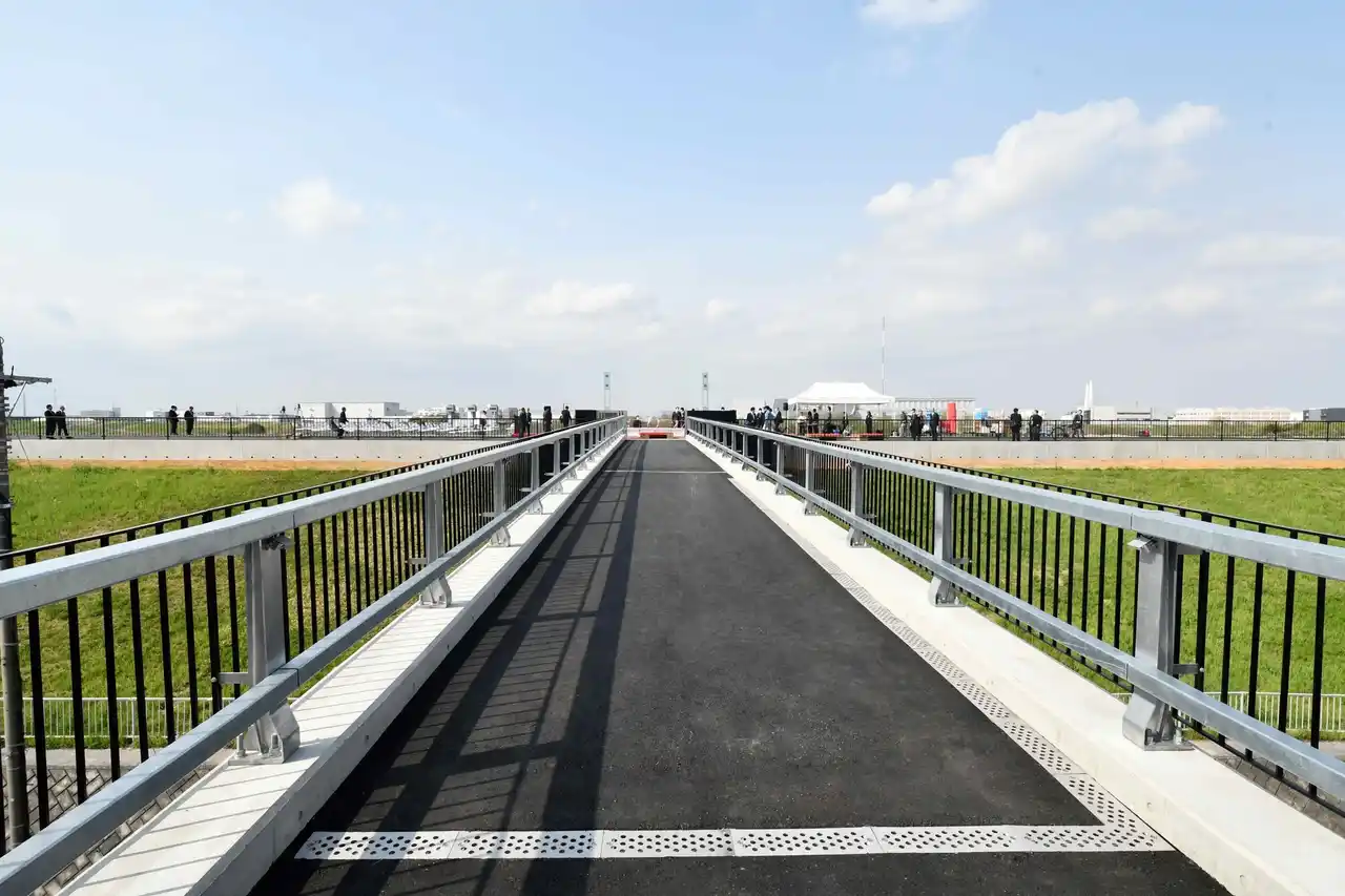 | 板橋区かわまちづくりの第1期事業として着手した荒川堤防と新河岸陸上競技場を繋ぐ連絡通路が完成し、令和8年3月30日に式典を開催しました。 | ||||||||||||||