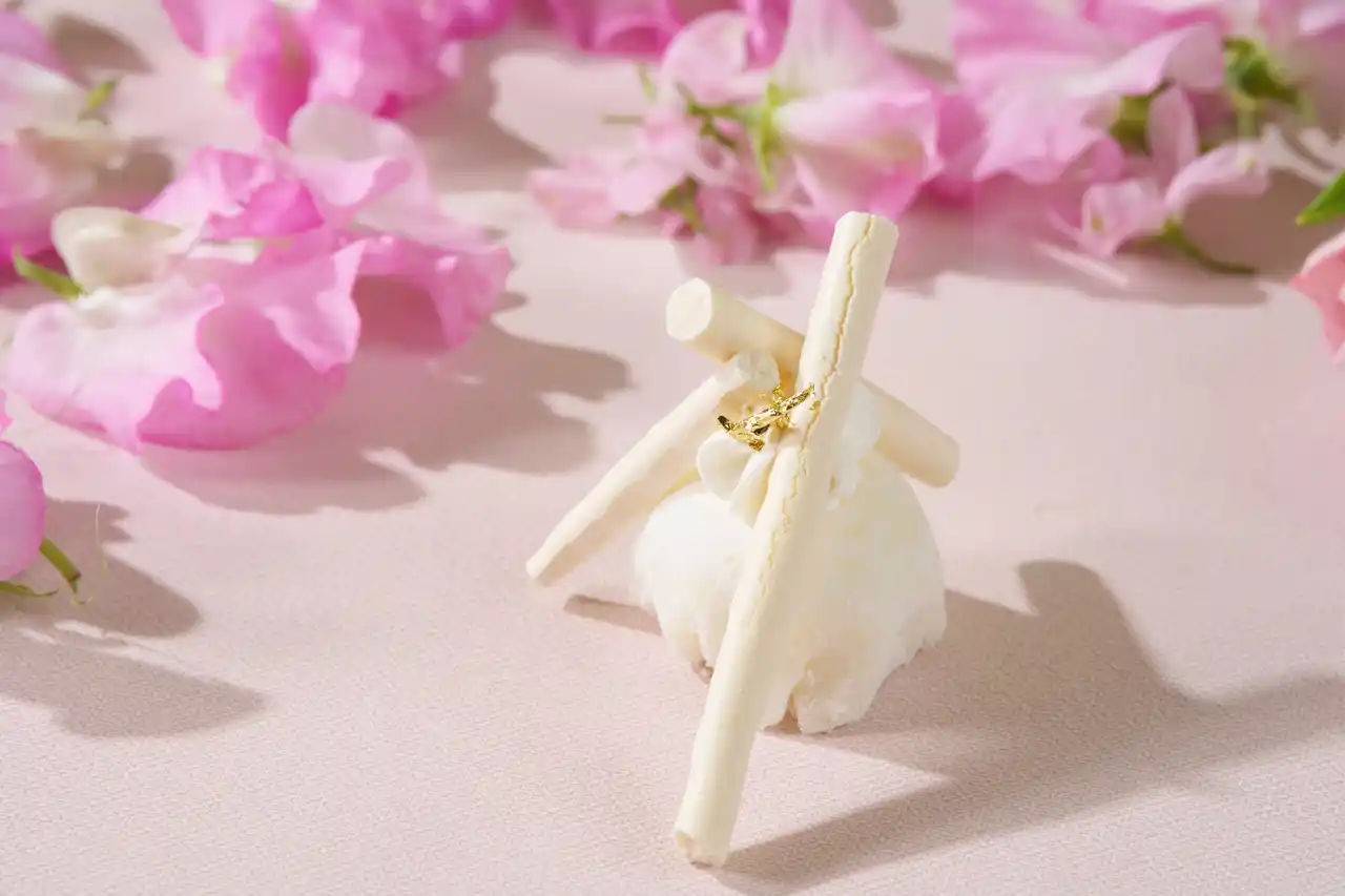 「メロンの和テイスト~大福~」(※3)は、果実味あふれるメロンを、薄く伸ばした求肥で優しく包み込んだ、遊び心を添えた一品です。主役であるメロンの味わいを際立たせるため、求肥の厚みや甘さを控えめにし、生クリームとともに丁寧に包みました。フレッシュなメロンの爽やかさと、大福ならではのもっちりとした食感が織りなす洗練された味わいをご堪能いただけます。 |