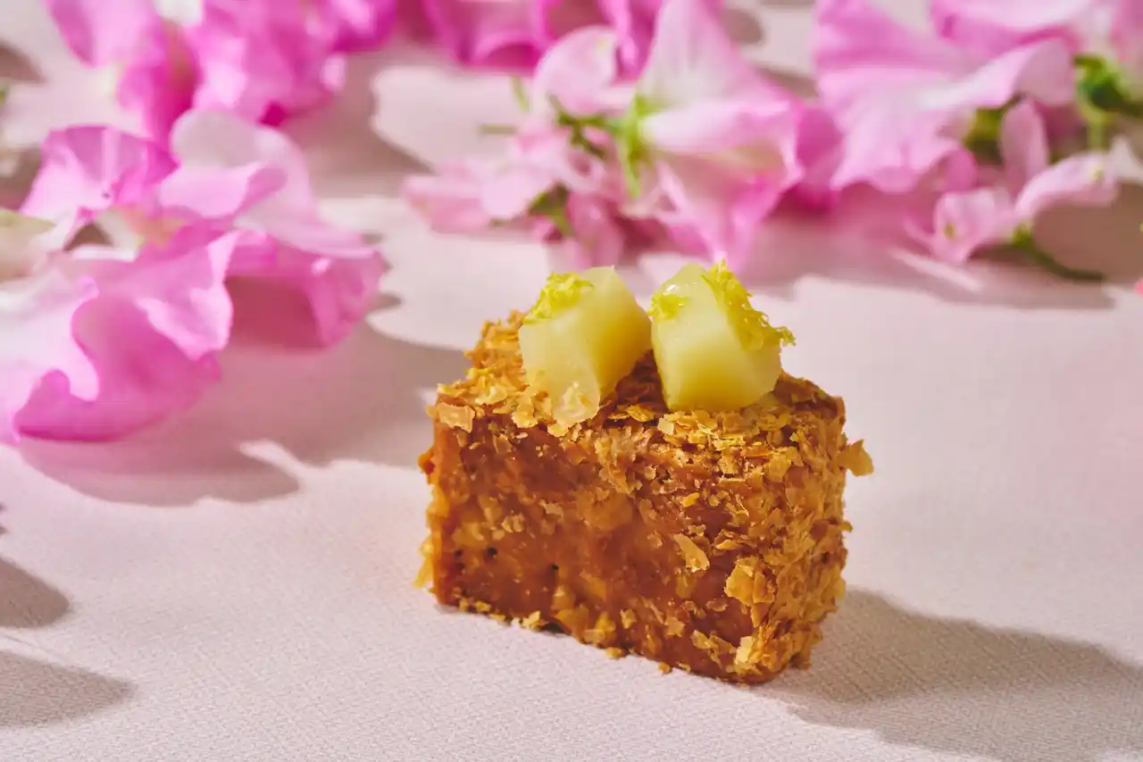 また、「ミルフィーユ 桃のシトラスマリネのマリアージュ」(※4)は、サクサクとした食感を存分にお楽しみいただくため、パイ生地を極限まで薄く焼き上げたこだわりの逸品です。レモンでマリネした桃に、カスタードクリームと生クリームを重ねることで、まろやかな甘みと爽やかな酸味のバランスを丁寧に整えました。最後に、レモンの皮を細かく削り、香りをまとわせるように添えることで、後味まで軽やかなアクセントを加えています。 |