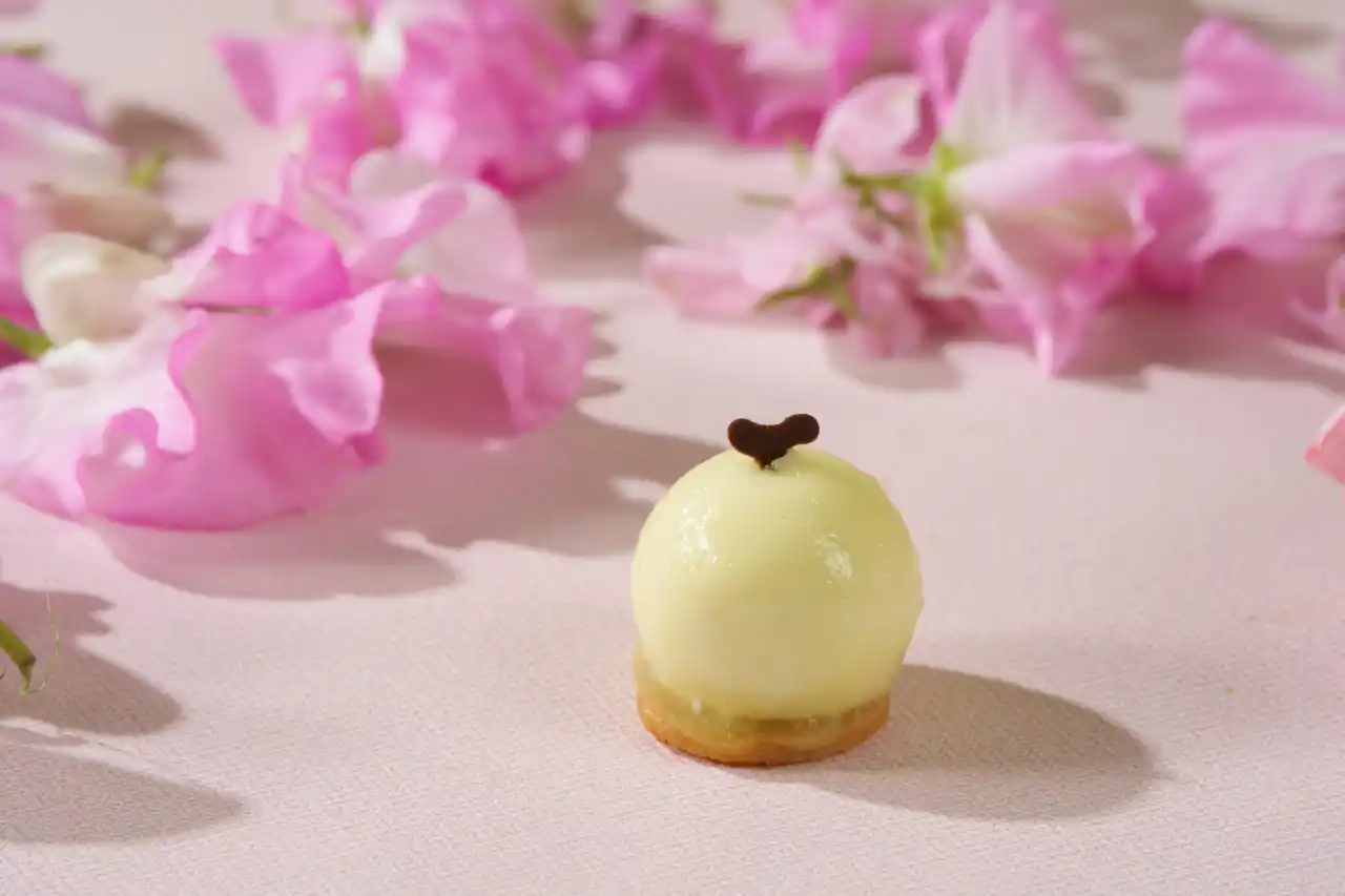 また、「ジューシーメロンタルト」(※2)は、アーモンドをふんだんに使用し、しっとりとした食感のタルト生地に、みずみずしいメロンをのせた一品です。トッピングには、可憐なエルダーフラワーをあしらい、気品ある佇まいに。仕上げにりんご果汁の繊細なゼリーシートを重ね、透明感のある美しい装いに仕立てました。 |
