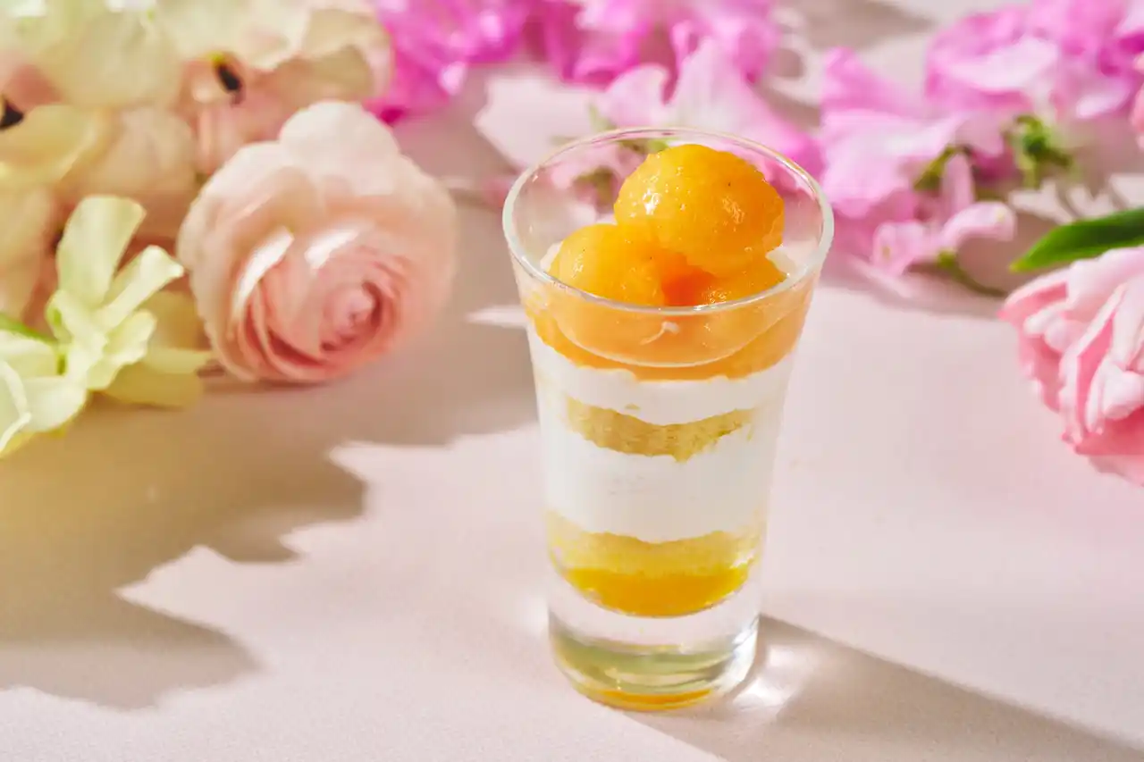 『メロンづくしのアフタヌーンティー~ピーチが彩る初夏のひととき~』は、みずみずしいメロンとやさしい甘みの桃を主役に、初夏にふさわしい爽やかなひとときをお届けします。定番のショートケーキをアレンジした「メロンショート~パフェStyle~」(※1)や、しっとりとした食感のタルト生地に、みずみずしいメロンをのせた「ジューシーメロンタルト」(※2)など、見た目にも華やかなスイーツ全8種を取り揃えました。セイボリーには、「竹炭のアメリカンドッグ スパイシーソースとご一緒に」や「桃の冷製ヴィシソワーズ 心地よいコンソメジュレのアクセント」など、甘味と調和する軽やかなセイボリー4種をご用意しております。 |