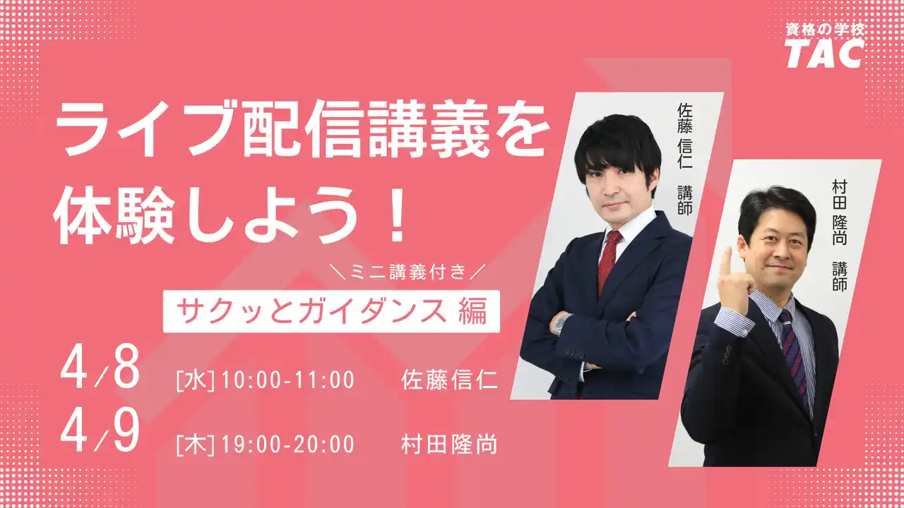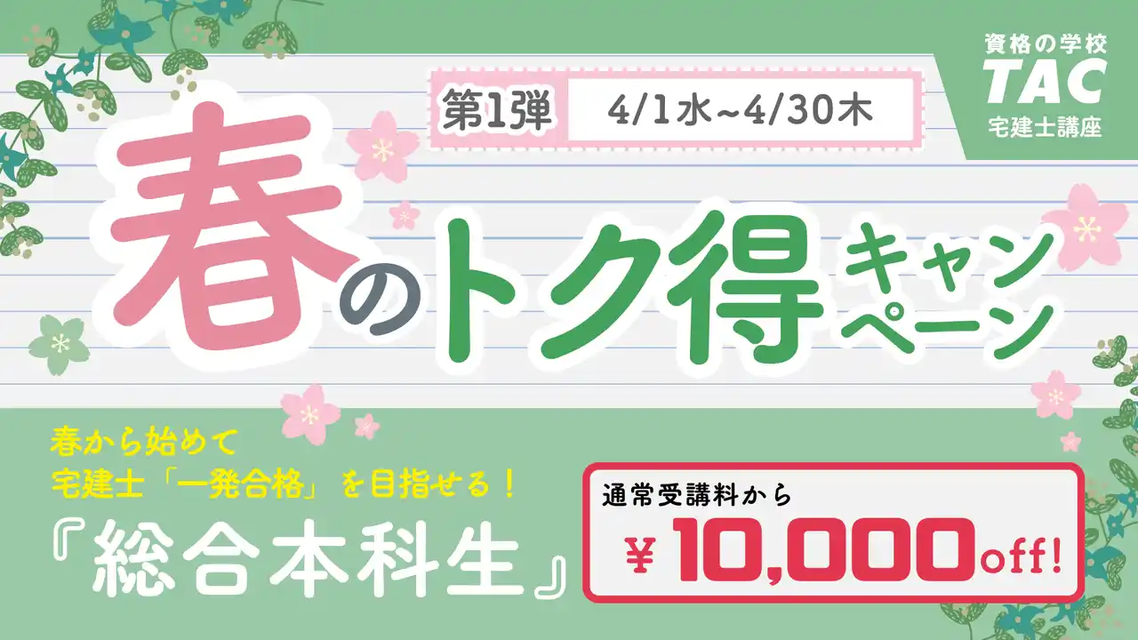 | 宅建試験対策講座を展開しているTAC株式会社(東京都千代田区)は、2026年(令和8年)の合格を目指す方に向けて、春のトク得キャンペーン第1弾を2026年4月1日より開始します。 | |||