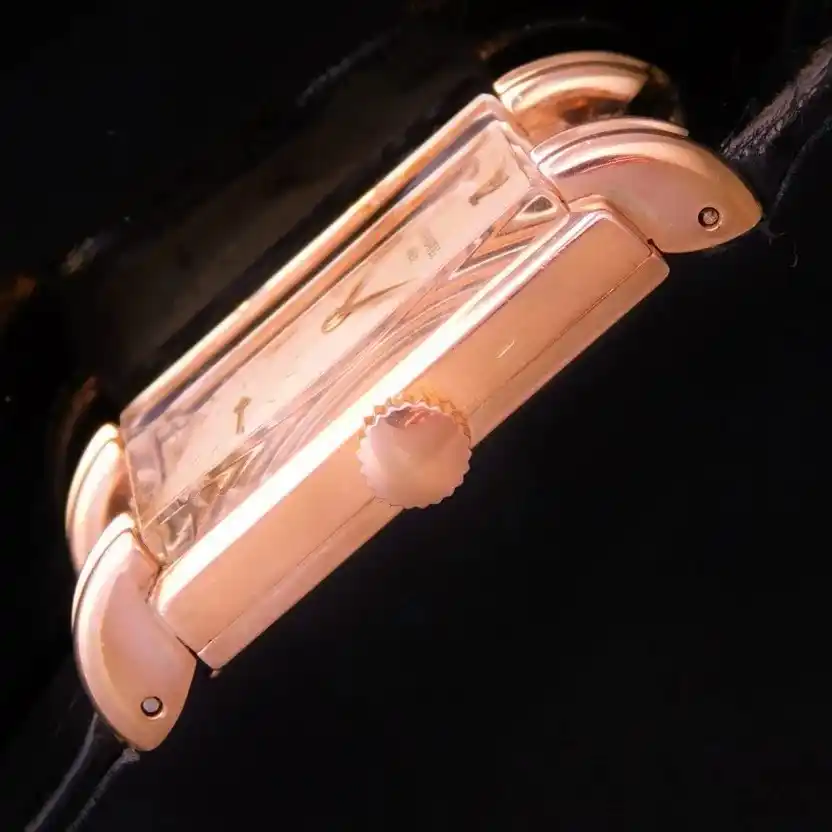 ケースは18Kローズゴールド製で、上下(12時側・6時側)に伸びる細長いラグと段差構造が特徴です。曲面と直線を組み合わせた設計となっています。 |