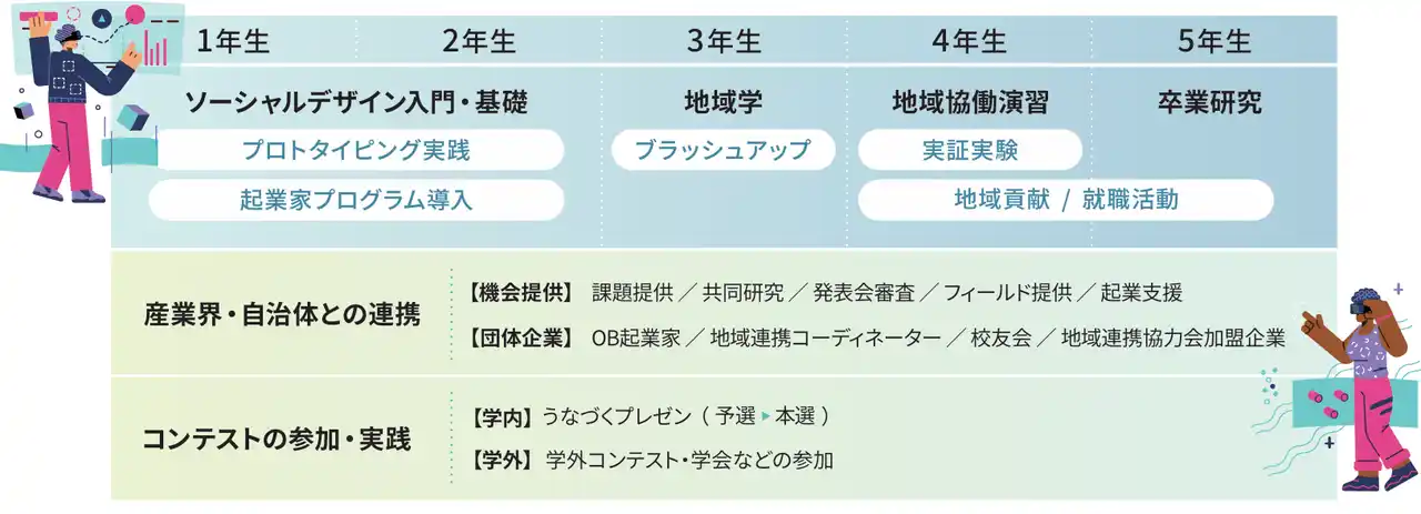 | アントレプレナーシップ教育を基盤として、1年次から5年次まで段階的に学ぶ社会実装教育を構築しており、特に4年次の「地域協働演習」を必修科目とし、全学生が地域企業や自治体と協働しながら実社会の課題に取り組む体制を整備しています。こうした中、教育課程全体を通じて社会実装を経験させる体系を正規科目として制度化し、全学生必修で展開している点などが評価され、今回の受賞に至りました。 | |||||||||||||||||||