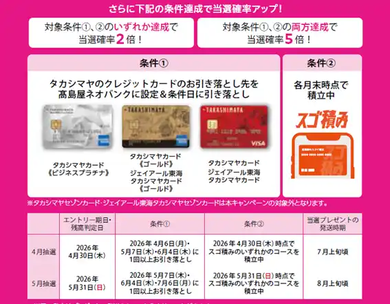 | ・プレゼントは高島屋ネオバンクにご登録の住所宛てに2026年4月抽選は7月上旬、5月抽選は8月上旬に発送いたします。 | |||