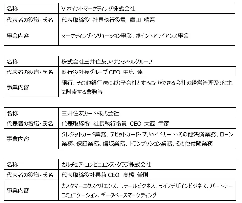 | 株式会社三井住友フィナンシャルグループ(執行役社長グループCEO:中島 達 以下「三井住友フィナンシャルグループ」、同社グループを総称して「SMBCグループ」)、三井住友カード株式会社(代表取締役 社長執行役員 CEO:大西 幸彦、以下「三井住友カード」)、カルチュア・コンビニエンス・クラブ株式会社(代表取締役社長兼CEO:高橋 誉則、以下「CCC」)、Vポイントマーケティング株式会社(代表取締役 社長執行役員:廣田 精吾、以下「Vポイントマーケティング」)は、2025年10月3日付の発表に基づき、2026年3月31日付でVポイントマーケティング(当時の商号:CCCMKホールディングス株式会社)を三井住友カードの子会社にいたしました。なお、CCCMKホールディングスは2026年4月1日付でVポイントマーケティングへ社名変更しております。 | |||