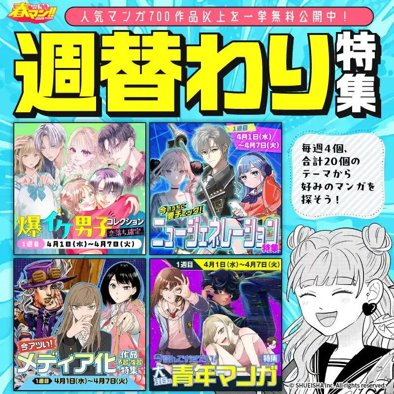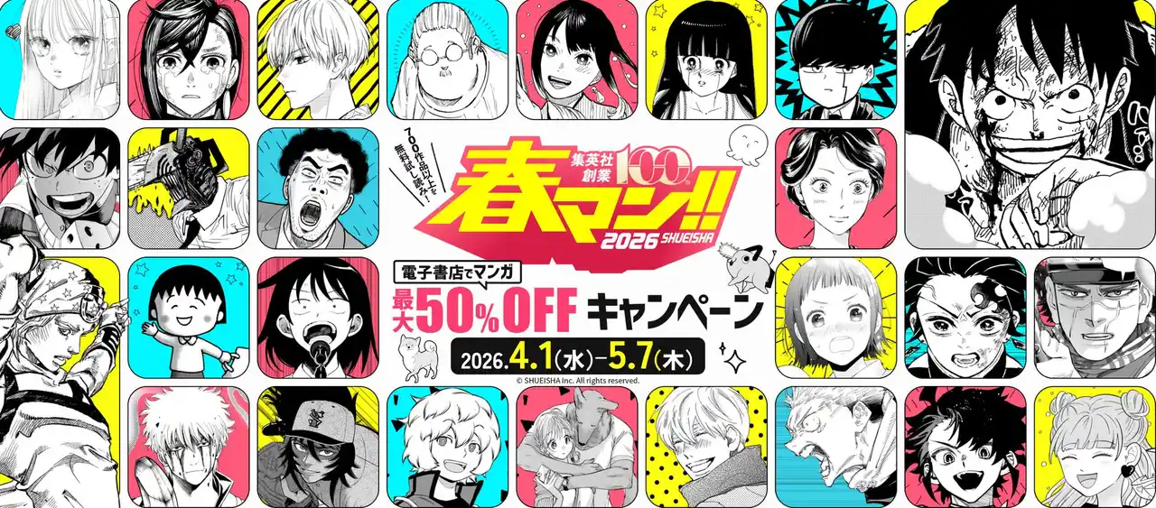 株式会社 集英社では配信中のデジタルコミックのキャンペーンとして、毎年恒例・春を彩るマンガの祭典「春マン!! 2026」を2026年4月1日(水)~5月7日(木)に実施いたします。 |