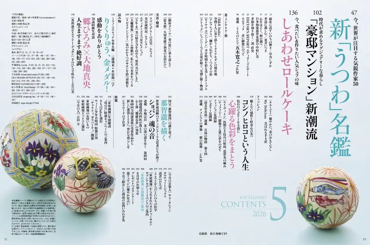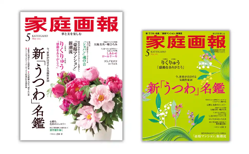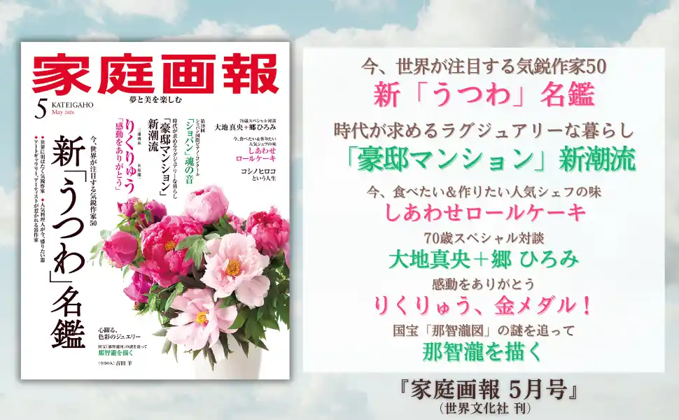 株式会社世界文化社は、『家庭画報 5月号』を4月1日(水)に発売します。巻頭特集「新『うつわ』名鑑」では、今、世界が注目する気鋭作家50人をご紹介します。「『豪邸マンション』新潮流」では、時代を代表する建築家による”スケルトンリフォーム”という設計術を拝見。さらに、人気パティシエ直伝レシピ&全国から厳選した最旬「しあわせロールケーキ」、70歳スペシャル対談「大地真央+郷 ひろみ」、本誌撮り下ろし&インタビューによる「りくりゅう、金メダル!」、11人の画家の誌上競作展「那智瀧を描く」など、美しい暮らしや知的好奇心をくすぐる企画満載でお届けします。