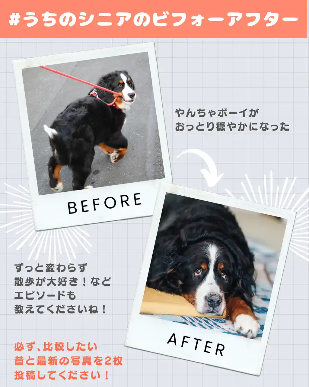 テーマタグ「#うちのシニアのビフォーアフター or #おでかけシニアさん」+キャンペーンタグ「#シニア犬生活応援隊」をつけて、愛犬写真をXに投稿してください。 |