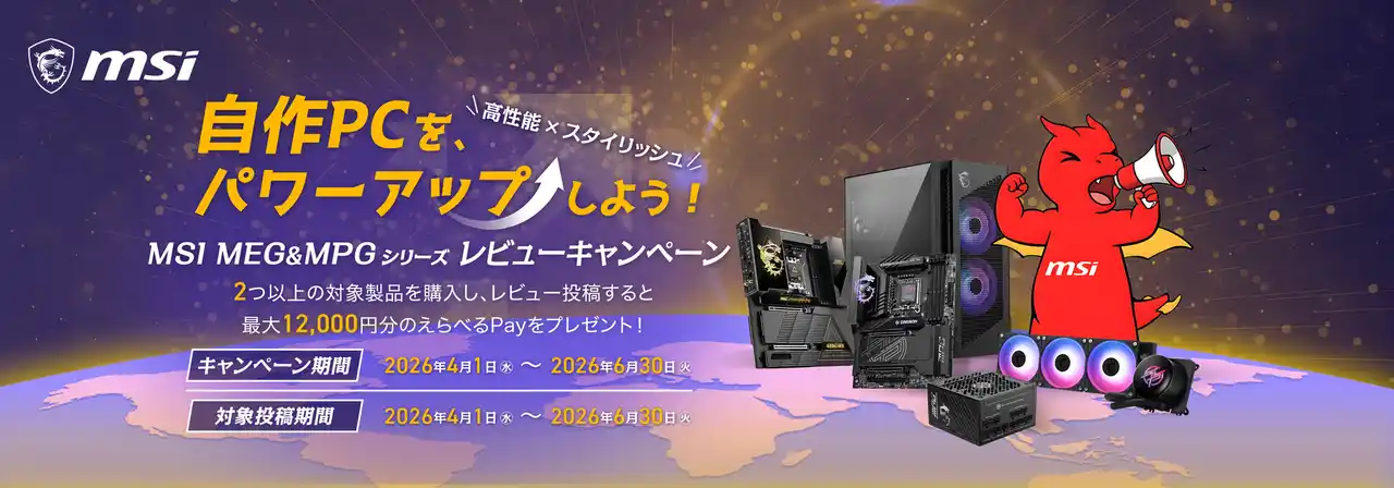 | この度、エムエスアイコンピュータージャパン株式会社は、2026年4月1日(水)から2026年6月30日(火)までの間、対象のMSI MEG MPGシリーズ製品を2点以上購入のうえ、正規販売店ECサイトもしくは価格.com等にレビューを投稿していただいたお客様全員に、最大12,000円分の「えらべるPay(R)」をプレゼントする「自作PCをパワーアップしよう!ーMEG MPGシリーズレビューキャンペーン」を開催いたします。 | |||