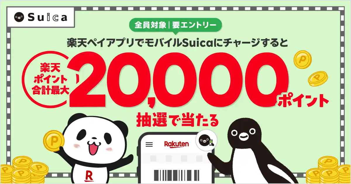 | 楽天ペイメント株式会社(以下「楽天ペイメント」)は、キャッシュレス決済サービス「楽天ペイ」アプリにおいて、抽選で最大20,000ポイントが当たる「モバイルSuica」チャージキャンペーンを、2026年4月1日(水)から5月31日(日)まで実施することをお知らせします。 | ||||||||||||