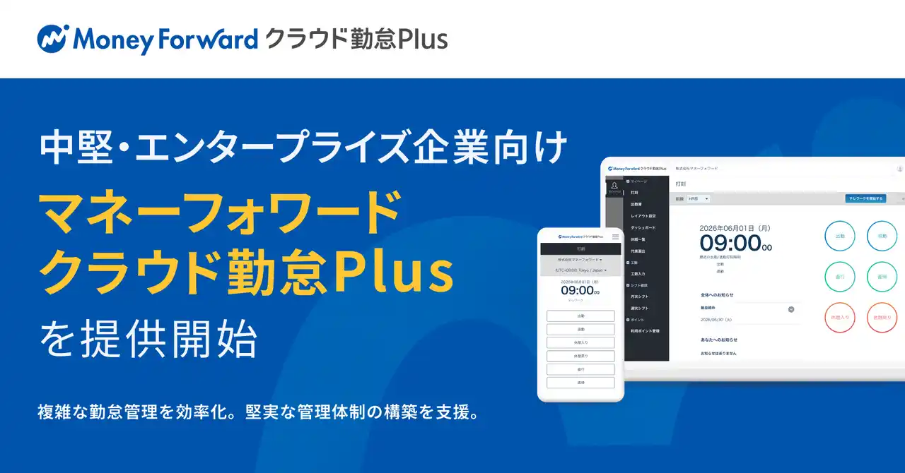 株式会社マネーフォワードは、2026年2月公表のAKASHI事業のグループジョインに伴い、本日より『AKASHI』から『マネーフォワード クラウド勤怠Plus』にリブランディングし、提供を開始します。これにより、多様な働き方や複雑な就業規則を持つ中堅・エンタープライズ企業のバックオフィス業務の効率化を強力に支援します。 |