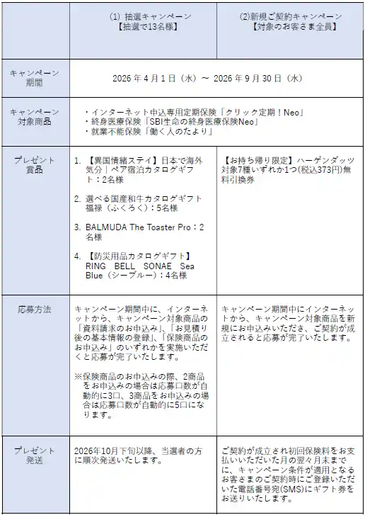 SBI生命保険株式会社(本社:東京都港区、代表取締役社長:篠原 秀典、以下「SBI生命」)は、2026年4月1日(水)より「SBI生命 10周年記念プレミアムキャンペーン」(以下、「本キャンペーン」)を実施いたします。 |