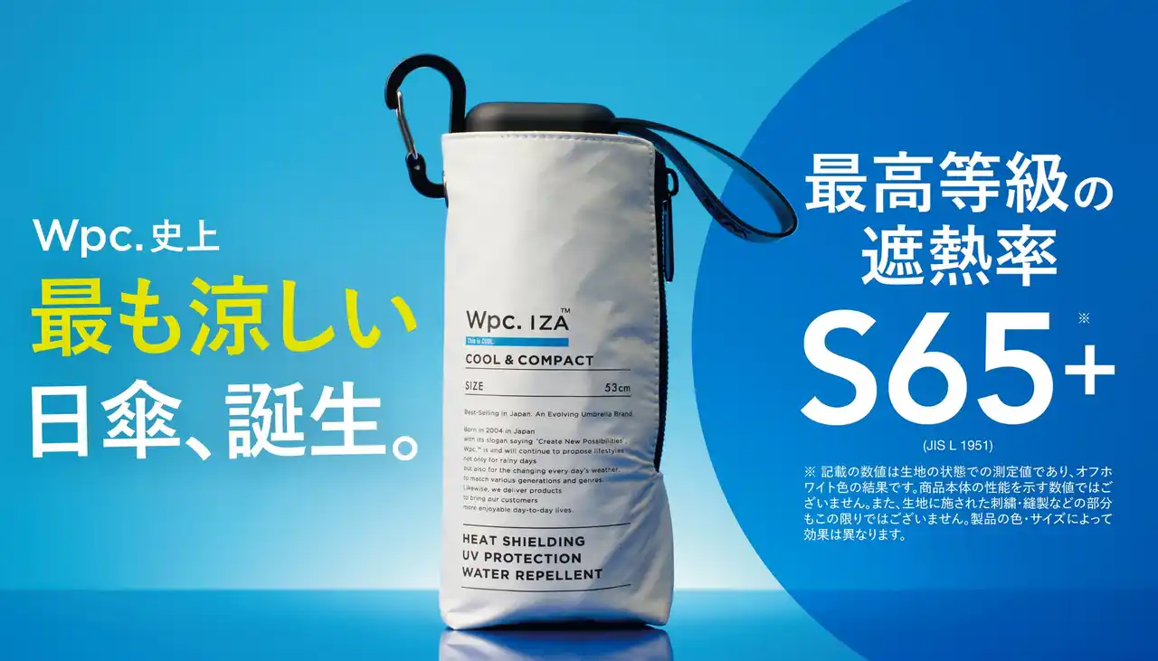 株式会社ワールドパーティー(本社:大阪市住吉区、代表取締役社長:冨田智夫)が展開する男の晴雨兼用傘「Wpc. IZA(ダブリュピーシーイーザ)」は、従来の機能に加えて、最高等級の遮熱率「S65+」*3生地を採用した新モデル「COOL & COMPACT」を、Wpc.直営店舗、Wpc. ONLINE STORE、ハンズ、ロフトにて2026年4月1日(水)より先行発売いたします。一般発売は7月より開始予定*4です。 |