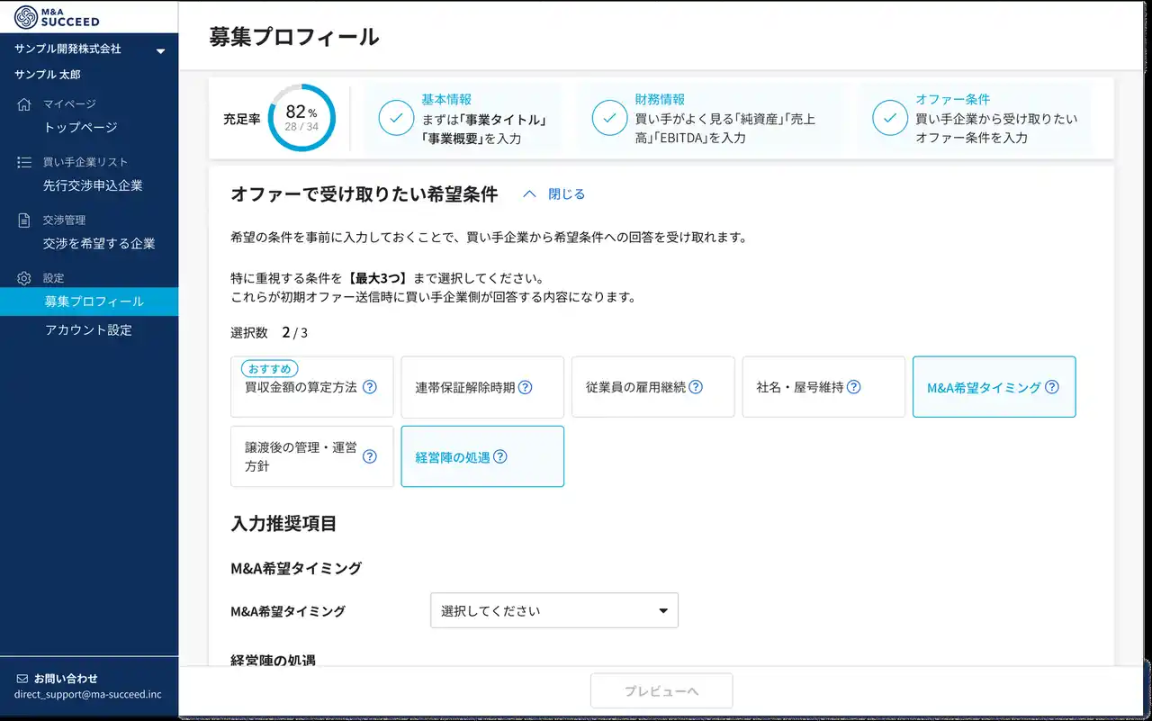 従来は交渉後期段階でしか得られなかった希望条件を初期段階で共有することで情報の非対称性を解消し、透明性が高く効率的なマッチングを実現します。早期段階でのミスマッチ防止により、成約までの期間短縮および納得感のあるM&Aに寄与します。 |