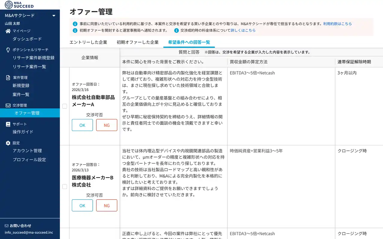 Visionalグループの株式会社M&Aサクシード(所在地:東京都渋谷区/代表取締役社長:金 蓮実)が運営する法人限定M&Aプラットフォーム「M&Aサクシード」(https://ma-succeed.jp/)は、譲渡を検討中のオーナー経営者が、自社の匿名情報とともに初期段階で知りたい具体的な条件や意向をあらかじめ設定し、譲受候補企業(買い手)から初期段階で収集できる「M&A初期オファー受付機能」の提供を開始しました。 |
