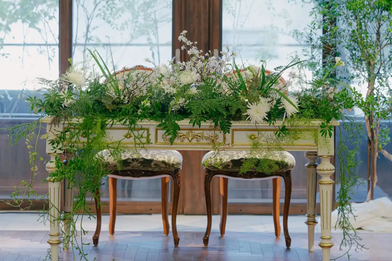 披露宴では、デザートカフェ長楽館のパティシエによるデザートビュッフェや、新郎新婦と打ち合わせて制作するオリジナル生ウエディングケーキを提供します。また、フレンチレストラン「FRENCH LE CHENE」料理長・橋本による季節のフレンチコースをご用意し、祝宴にふさわしい料理体験を提供します。さらに、重要文化財附指定のクラシカルなテーブルをメインテーブルとして使用するコーディネートも可能で、歴史的空間ならではの設えをお楽しみいただけます。 |