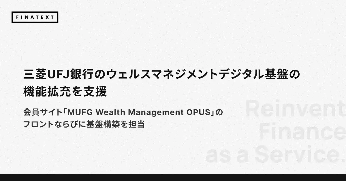 次世代金融インフラの提供を通して組込型金融を実現するFinatextグループの株式会社Finatext(本社:東京都千代田区、代表取締役CEO:木下あかね、以下「当社」)は、株式会社三菱UFJ銀行(本社:東京都千代田区、取締役頭取執行役員:大澤正和、以下「三菱UFJ銀行」)が2026年3月24日より展開するウェルスマネジメント会員サイト「MUFG Wealth Management OPUS(MUFGウェルスマネジメント オーパス)」のフロントならびに基盤構築を支援したことをお知らせします。 |