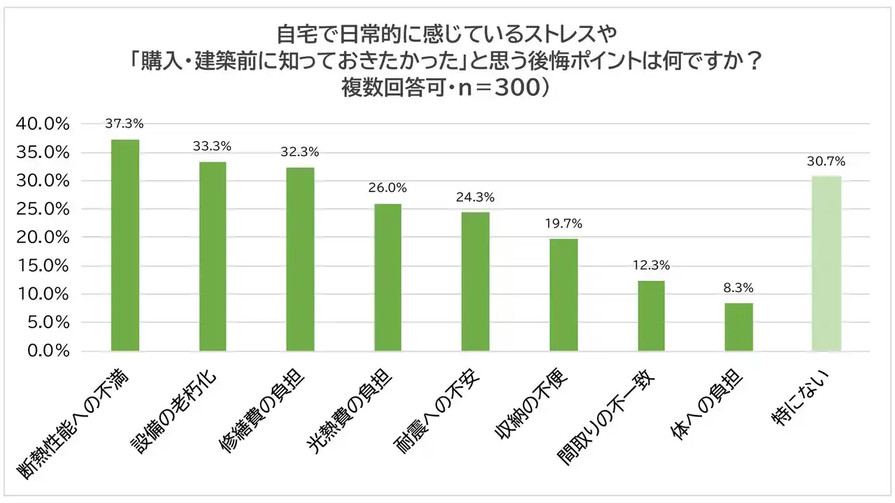 自宅で日常的に感じているストレスや「購入・建築前に知っておきたかった」と思う後悔ポイント |