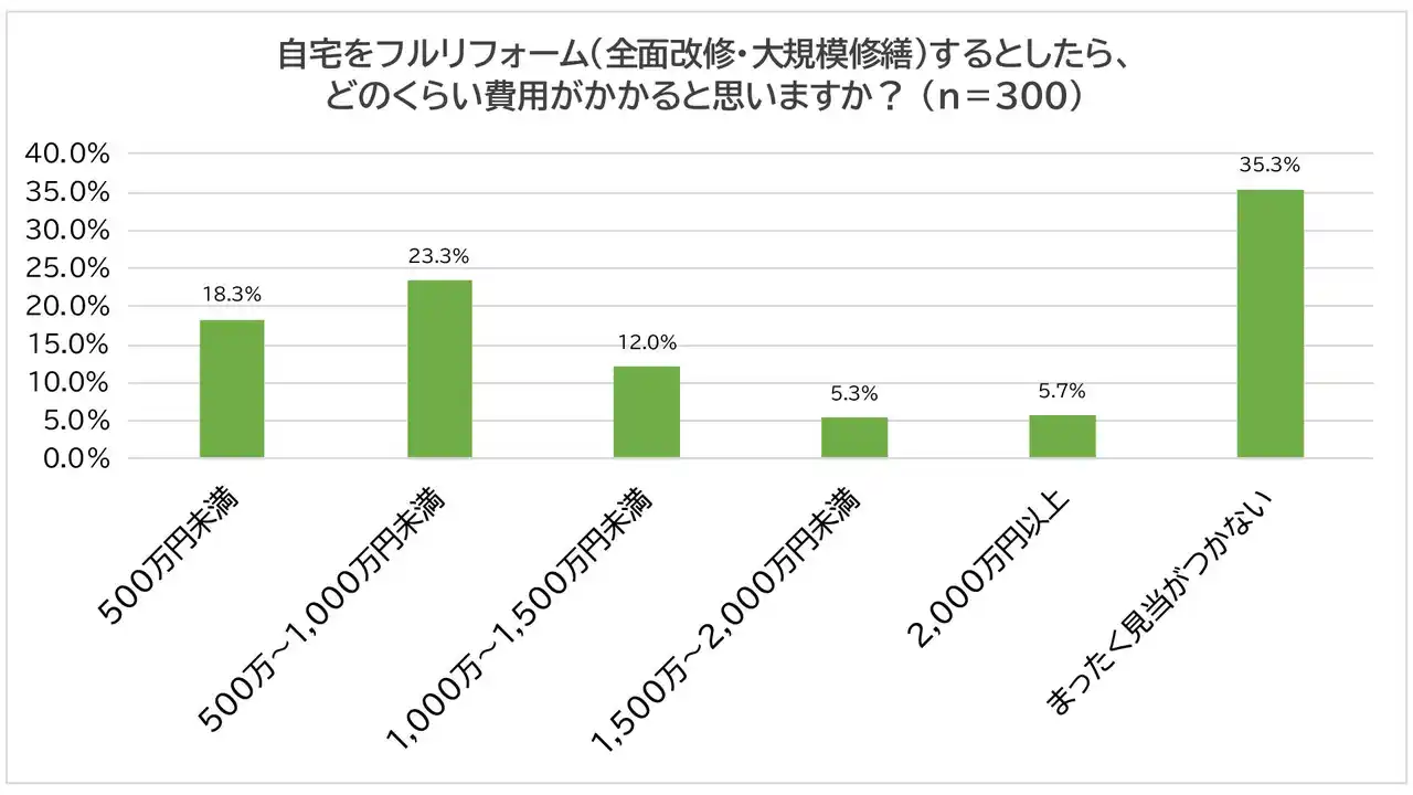 「自宅をフルリフォーム(全面改修・大規模修繕)するとした場合の費用イメージ」について尋ねたところ、最も多かったのは「まったく見当がつかない」(35.3%)でした。 |