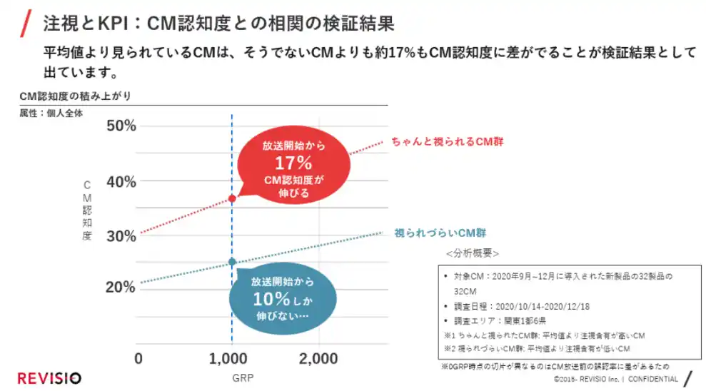 REVISIOの調査では、CM認知の向上には「アテンション」が相関することがわかっています。このデータを活用することで「視聴者によく視られ、しっかり伝わるCM」を目指しました。 |