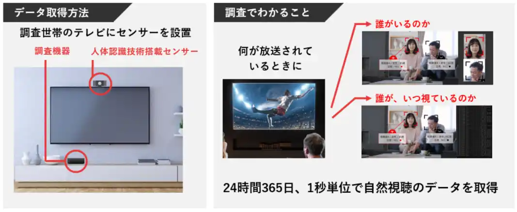 現在、国内では関東エリアの2,000世帯・関西エリア600世帯を調査対象とし、地上波の全番組の視聴データ、ならびにコネクテッドTVの注視データを提供しています。 |