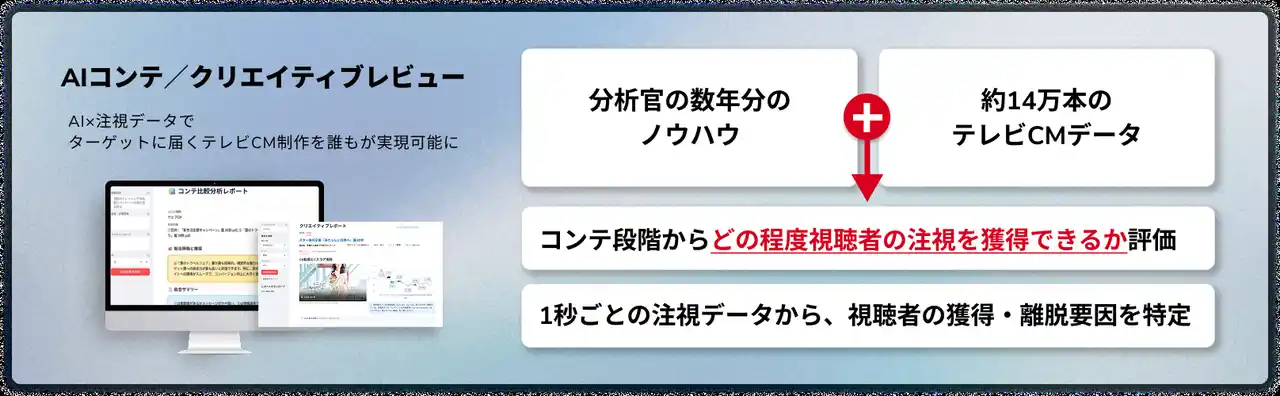 今回の制作では、企画コンテ(10案)、Vコン(4案)、演出コンテ、オフライン編集の各段階において「AIコンテレビュー」による評価を実施しました。これにより「視聴者の視線を惹きつけられる演出」を効率よくクリエイティブに反映させることができました。 |