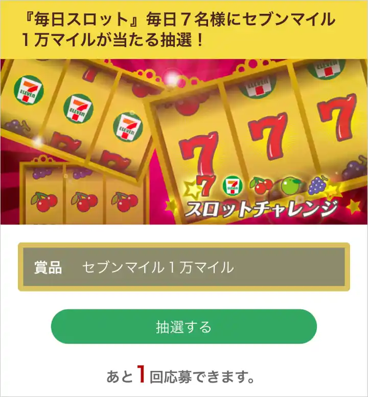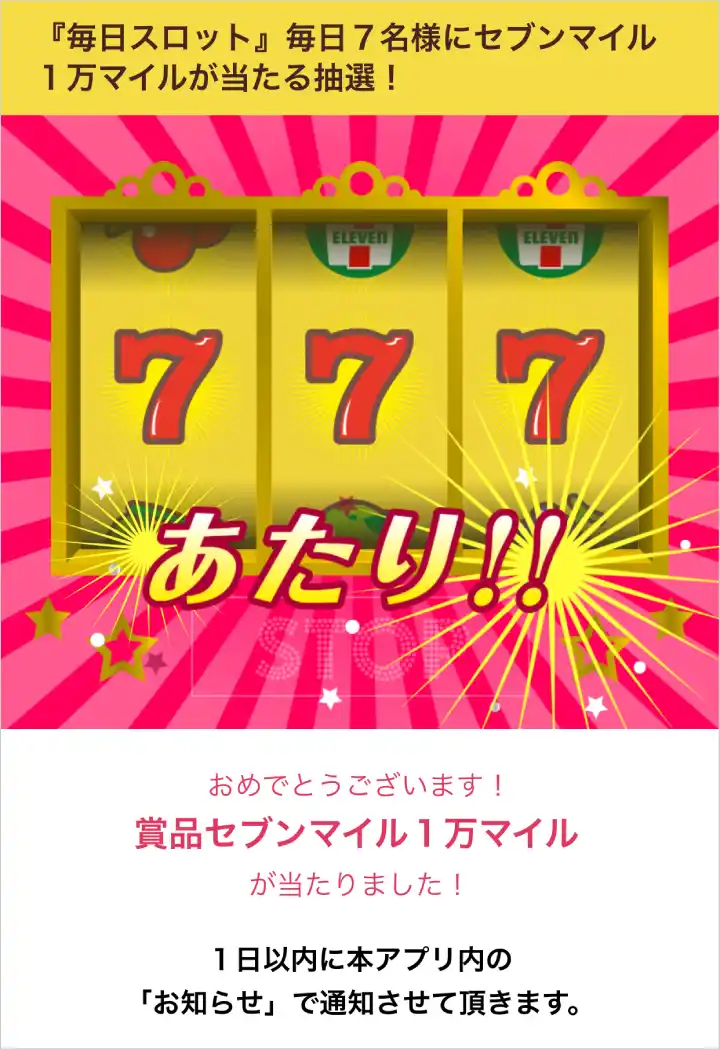 内容:実施期間中にセブン‐イレブンアプリで、スロットに参加した方の中から抽選で毎日7名様にセブンマイル10,000マイルが当たります。 |