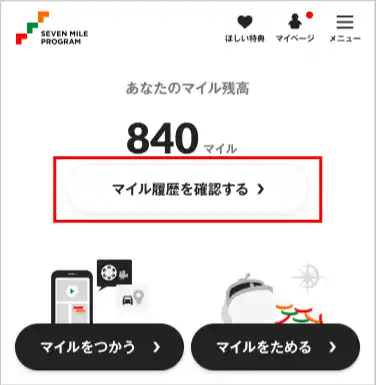 マイルの付与状況は、セブンマイルプログラムサイトのトップページ「マイル履歴を確認する」より確認できます。 |