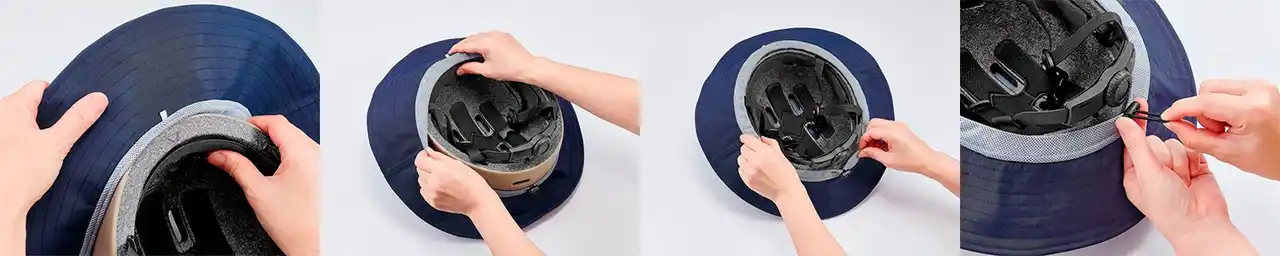 帽子のフチをヘルメットのフチにかぶせていく。 |