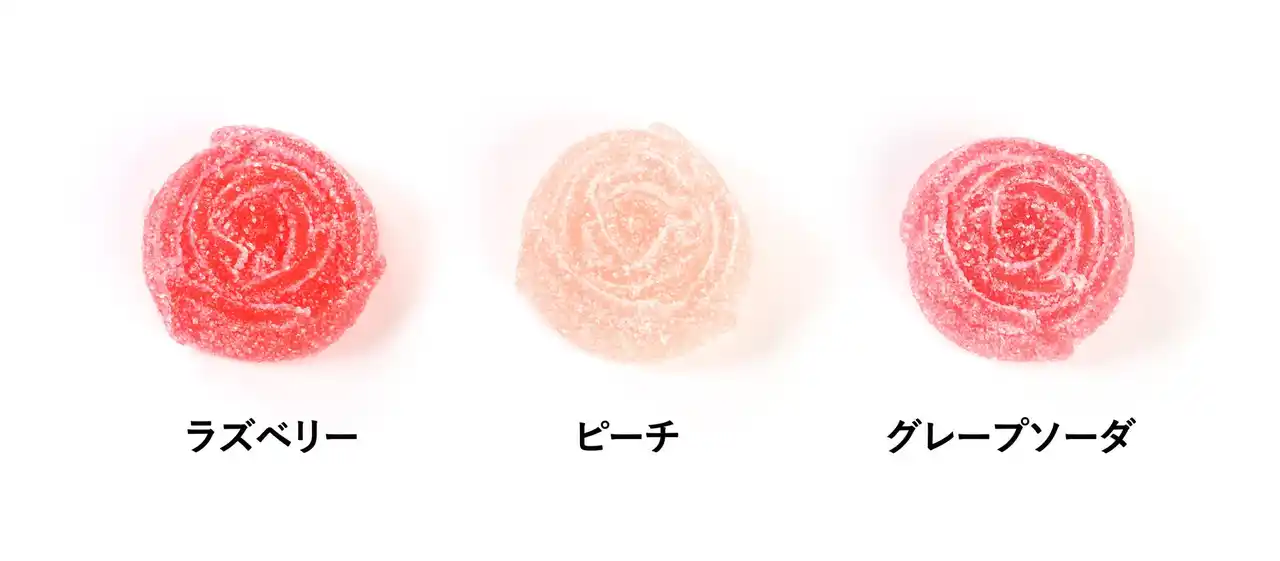 フレーバーとカラーには、それぞれカーネーションの花言葉を重ねています。ラズベリーの赤は「母への愛」や「深い愛」、ピーチのピンクは「感謝」や「温かい心」、グレープソーダの紫は「気品」や「誇り」をイメージしています。甘酸っぱいフルーティーな味わいとともに、見た目だけでなく意味でも華やかさを感じられる仕上がりです。 |