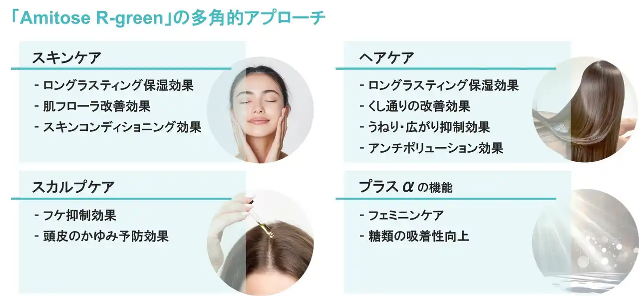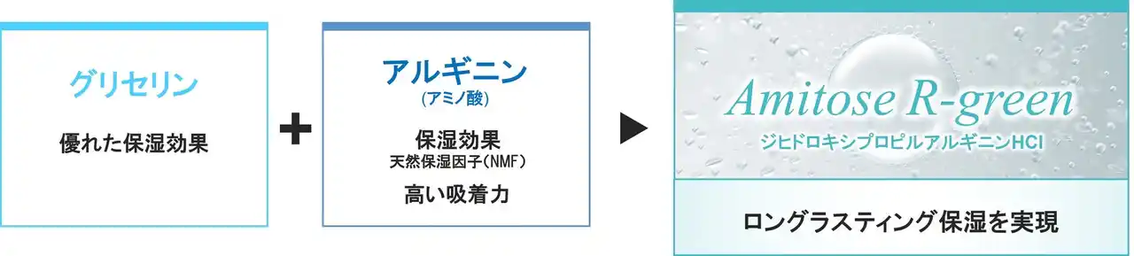 こうした背景のもと、当社は、グリセリンとアルギニンを融合させることで長時間うるおいが続くロングラスティング保湿と、サステナビリティを両立するアミノ酸誘導体「Amitose(R) R-green」を開発いたしました。 |