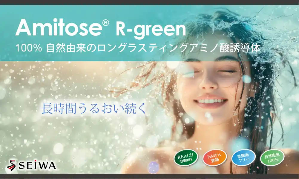 化粧品原料の研究・製造を行う株式会社成和化成(本社:大阪府東大阪市、代表取締役:吉岡正人)は、100%自然由来のロングラスティング保湿を実現する新規アミノ酸誘導体「Amitose(R) R-green」を開発(2026年4月より発売)いたしました。 |