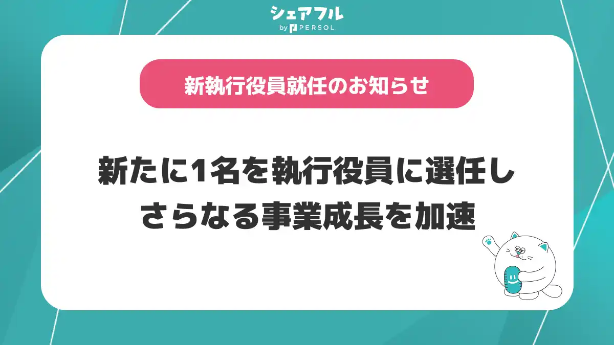 この度、シェアフルが掲げる"誰もの「はたらく」をひろげ、新しい「はたらく」をつくる"というミッションのもと、事業成長をさらに加速させるために、新たに執行役員を選任いたしました。 |