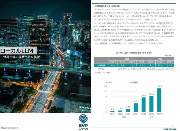 会員制マーケットリサーチサービスを提供している、株式会社SVPジャパン(本社:東京都中央区、代表取締役社長:橋本 雅、以下「SVPジャパン」)は、本日、SVP注目市場分析レポート「ローカルLLM-世界市場の現状と将来展望-」を、会員企業向けに公開いたしました。 |